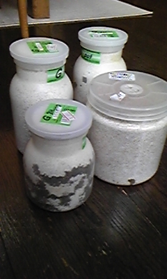 ビンにはコクワガタがいます。菌糸ビンというのは、クヌギやナラなどの木を細かくマット状にしたものにいろいろなキノコ(オオヒラタケ、カワラタケなど)